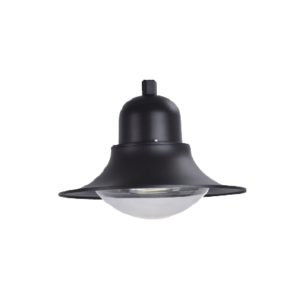 A decorative lantern with a cast aluminium head and spun aluminium shade and vandal resistant opal polyethylene domed diffuser, with shepherd’s hook mounting. Powdercoat polyester finish – Standard colours Black – White- Hawthorne Green.